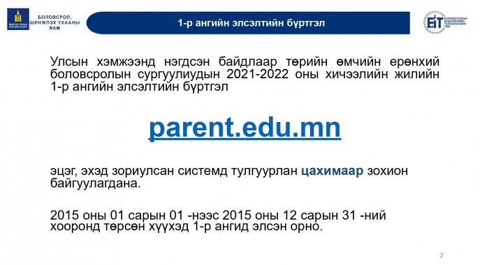 Эцэг, эхчүүд та бүхэн Наймдугаар сарын 16-наас 25-ны хооронд www.parent.edu.mn вэбсайтад хандан, бүртгэлийг баталгаажуулснаар тухайн сургууль элсэгчдийн анги, бүлгийг хуваарилах юм. Систем 16-ны өдрийн 09.00 цагт нээгдэн...