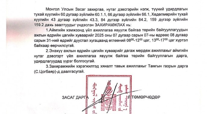 Аймгийн Засаг даргын А/367 дугаар захирамжаар 2025 оны 07 дугаар сарын 07-ны өдрөөс 08 дугаар сарын 31-ний өдрийг дуустал хугацаанд ажлын цагийн хуваарийг 08:00-17:00 цаг ...