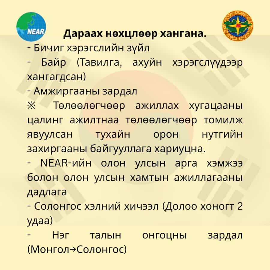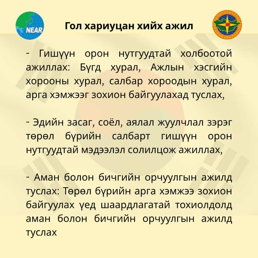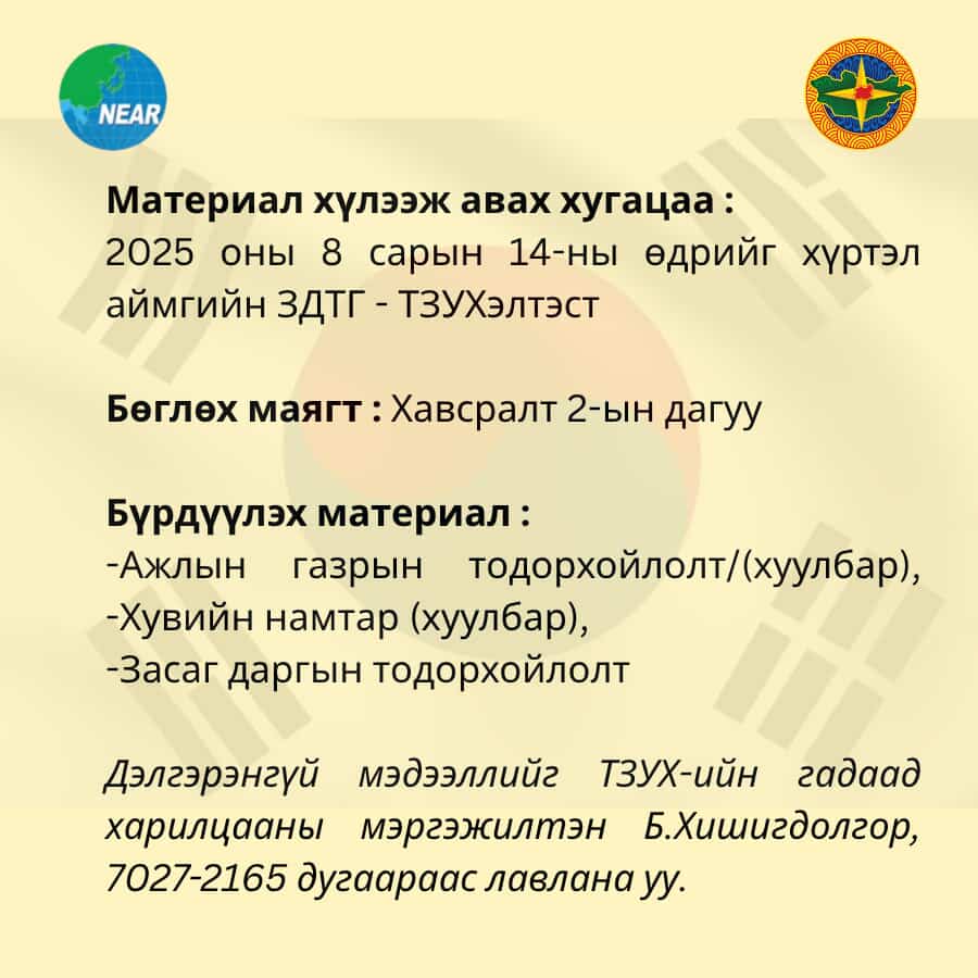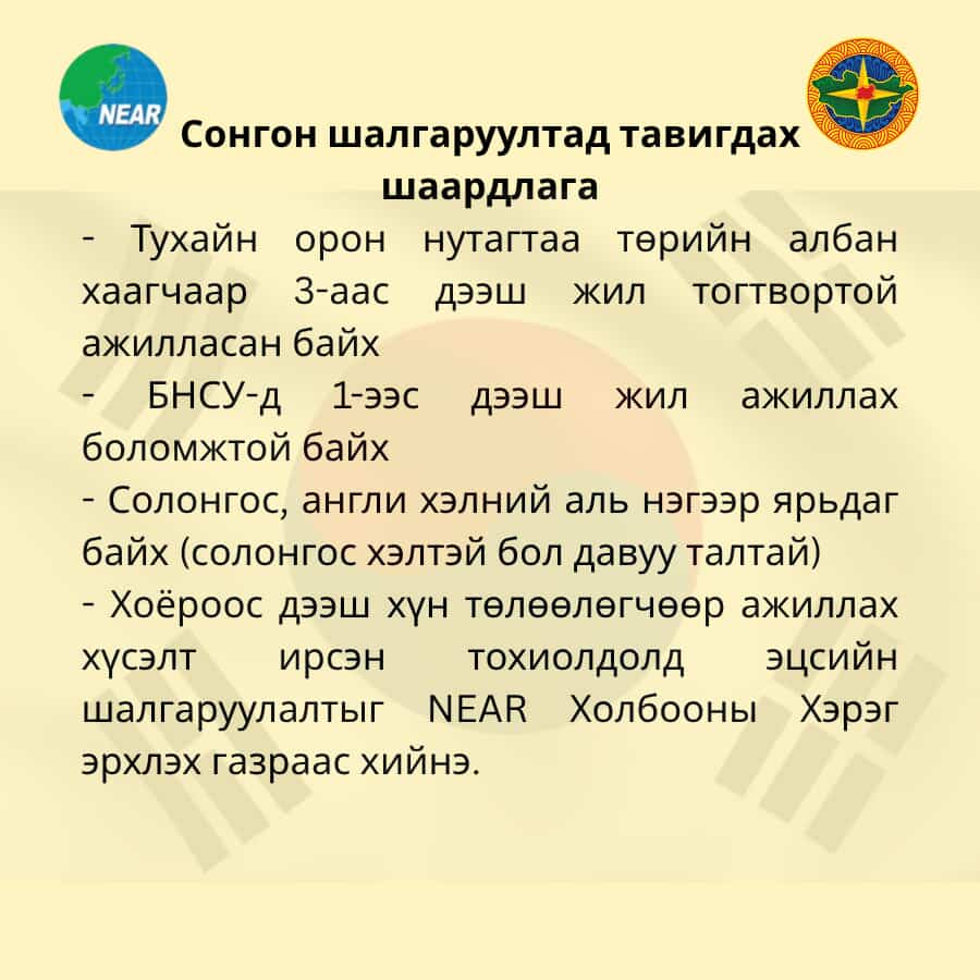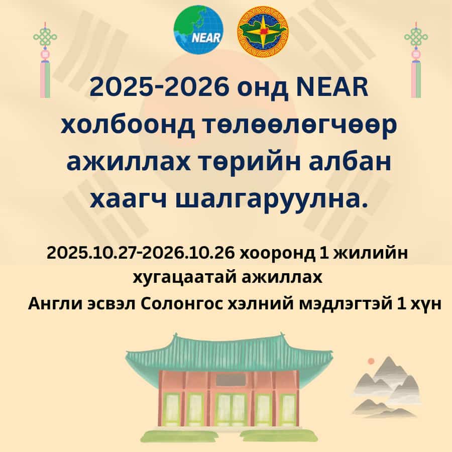 Бүгд Найрамдах Солонгос Улсын Гёнсанбук мужид үйл ажиллагаа явуулдаг Зүүн Хойд Азийн бүс нутгуудын Засаг Захиргааны холбоонд 1 жилийн хугацаатай төлөөлөгчөөр ажиллах төрийн албан хаагч шалгаруулна.