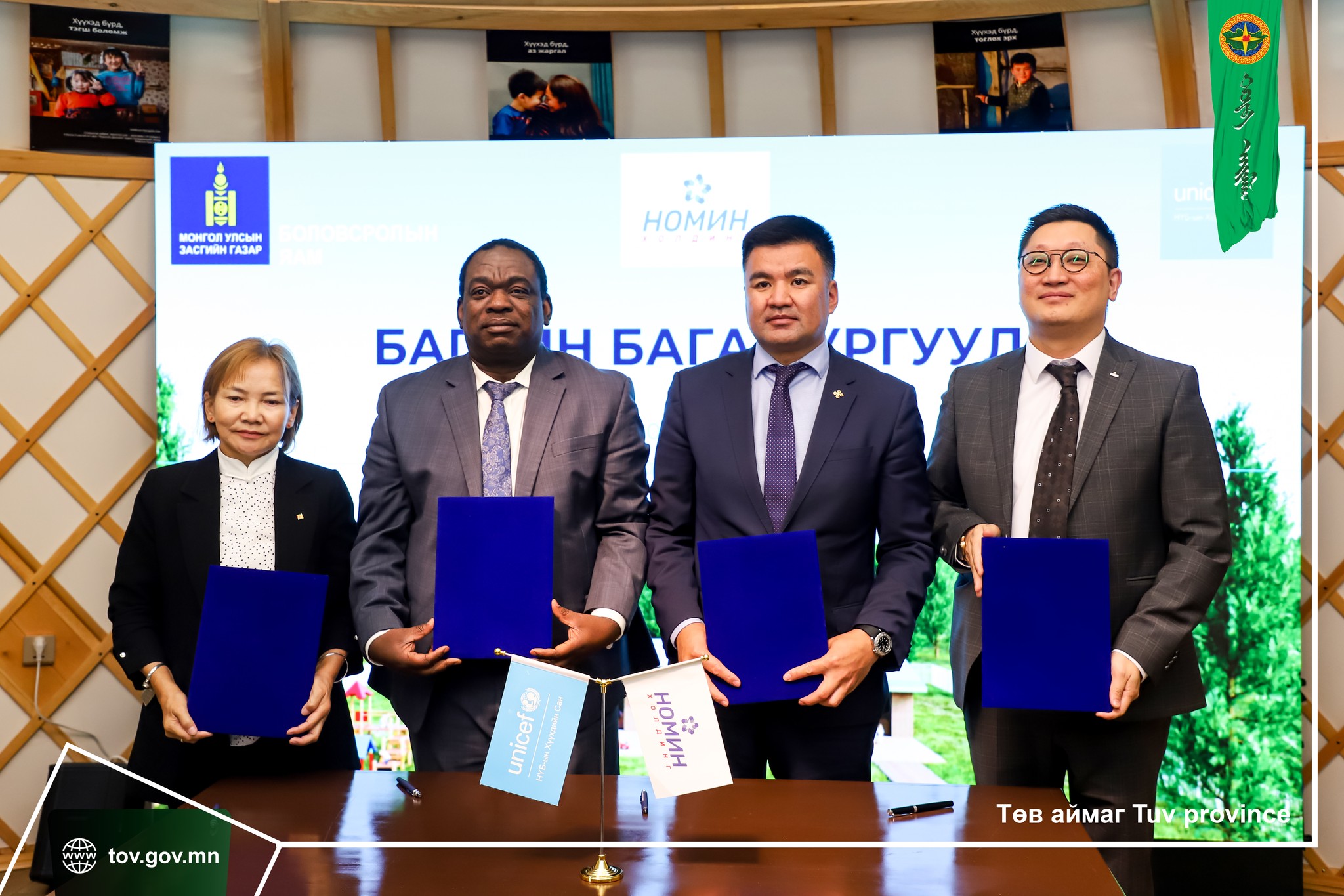Аймгийн Засаг дарга Л.Төмөрчөдөр, Боловсролын газрын дарга Ц.Нарантуяа нар НҮБ-ын Хүүхдийн Сангийн "БАГИЙН БАГА СУРГУУЛЬ" төслийн Батсүмбэр сумын Цогт-Өндөр багт хэрэгжүүлэхээр Суурин төлөөлөгч Эваристе Коуасси-Комлан боло хөрөнгө оруулагч Номин холдинг ХХК-ийн удирдлагатай гэрээг үзэглэлээ.
