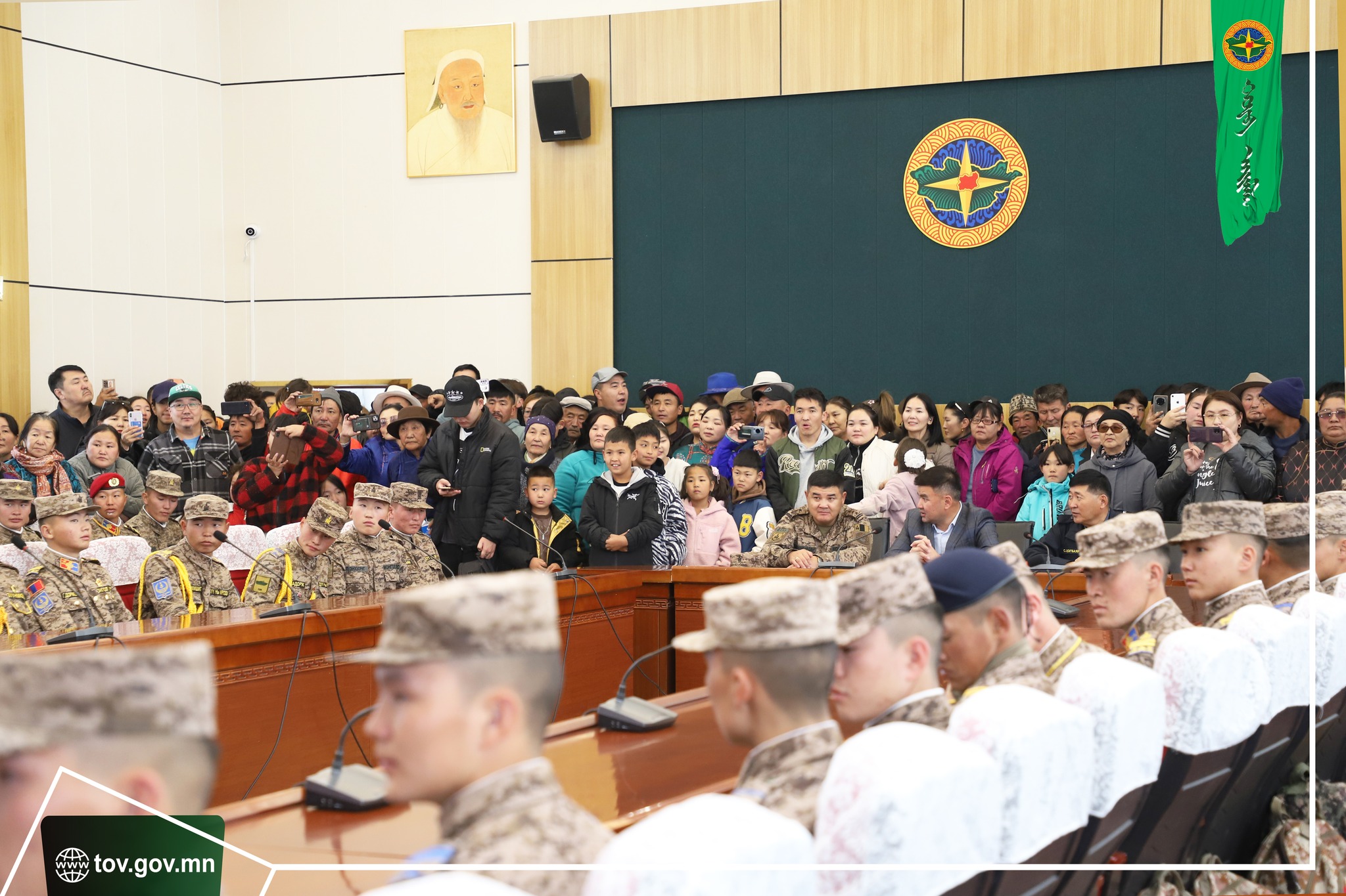 Эх орныхоо сүр хүч, цог золбоо, хийморийн бэлгэдэл болж Монгол Улсын Үндсэн хуулиар хүлээсэн журамт үүргээ биелүүлэн Төв сайхан нутгийнхаа нэр хүндийг өндөрт өргөн эр цэргийн албаа нэр төртэй хааж, халагдаж ирсэн эх оронч хөвгүүдээ өнөөдөр угтан авч, хүндэтгэл үзүүллээ.
