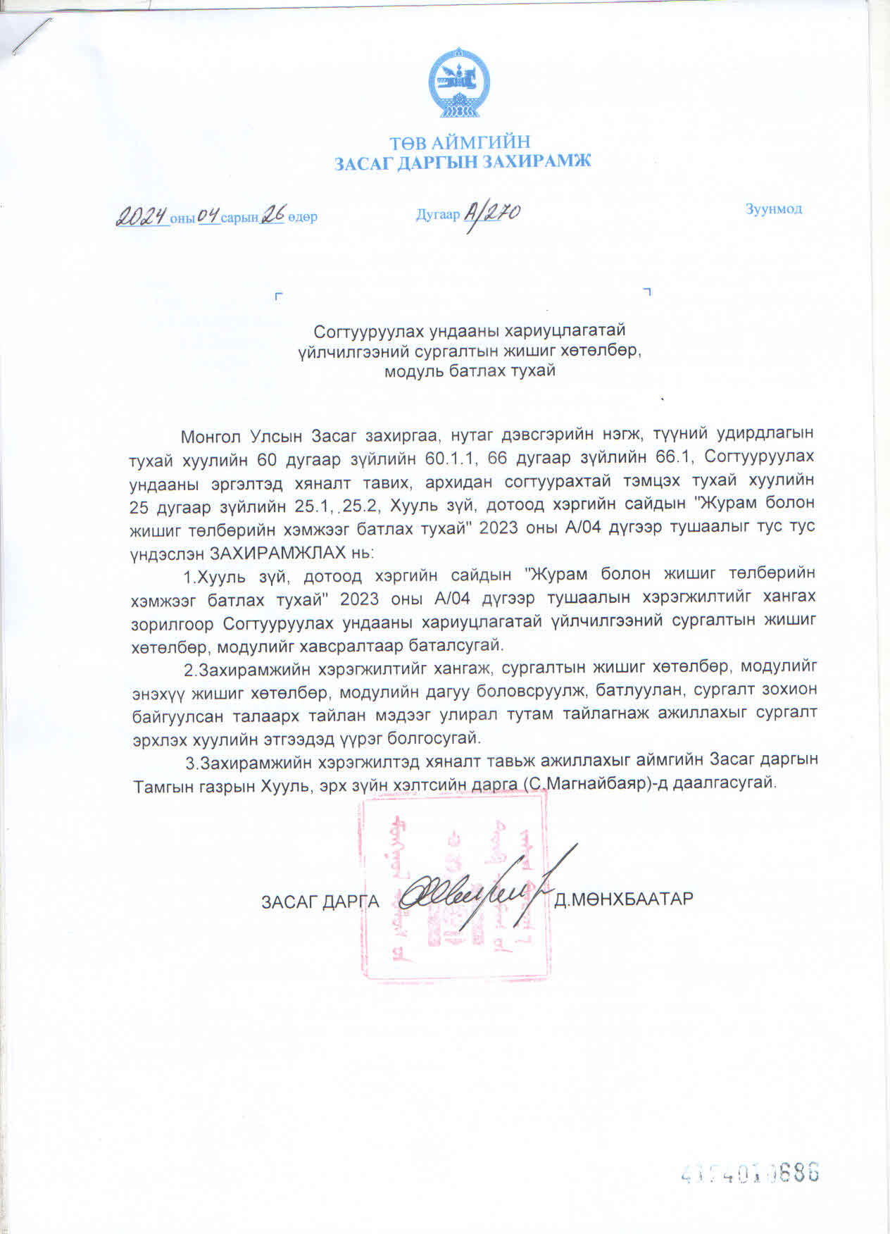 Согтууруулах ундааны хариуцлагатай үйлчилгээний сургалт явуулах төрийн бус байгууллагыг сонгон шалгаруулах тухай Согтууруулах ундааны эргэлтэд хяналт тавих, архидан согтуурахтай тэмцэх тухай хуулийн 25 дугаар зүйлийн 25.1, 25.2, Хууль зүй, дотоод хэргийн сайдын "Журам болон жишиг төлбөрийн хэмжээг батлах тухай" 2023 оны А/04 дүгээр тушаалын дагуу аймгийн хэмжээнд согтууруулах ундаа худалдан борлуулдаг болон түүгээр үйлчилдэг иргэн, аж ахуйн нэгжүүдэд “Согтууруулах ундааны хариуцлагатай үйлчилгээний сургалт” явуулах Төрийн бус байгууллагыг сонгон шалгаруулна. Дээрх сонгон шалгаруулалтад орох ТББ нь дараах шаардлагыг хангасан байна. Үүнд: Төрийн бус байгууллагын тухай хуулийн 10 дугаар зүйлд заасан ерөнхий шаардлагыг бүрэн хангасан байх, Ашгийн төлөө бус төрийн бус байгууллага байх, Төрийн бус байгууллагын сургалтыг заах багш нар нь Хууль, эрх зүй, анагаах ухааны болон сэтгэл судлалын чиглэлээр бакалаврын зэрэг эзэмшсэн байх, Сонирхсон ТББ нь холбогдох материалаа оны 05 дугаар сарын 10-ны өдрийн дотор аймгийн Засаг даргын Тамгын газрын Хууль, эрх зүйн хэлтэст ирүүлнэ үү. Ирүүлэх материал: Сургалт явуулах тухай хүсэлт ТББ-ын гэрчилгээ болон сургалт заах багш нарын мэргэжлийн дипломын хуулбар Аймгийн Засаг даргын 2024 оны А/270 дугаартай захирамжаар баталсан сургалтын жишиг хөтөлбөр, модулийн хүрээнд бэлтгэсэн 4 цагийн багц сургалтын хичээл, гарын авлага ирүүлэх. Холбогдох мэдээллийг 91136996 дугаарын утаснаас авна уу. Жич: Аймгийн Засаг даргын 2024 оны “Согтууруулах ундааны хариуцлагатай үйлчилгээний сургалтын жишиг хөтөлбөр, модуль батлах тухай” А/270 дугаартай захирамжийг хавсаргав.