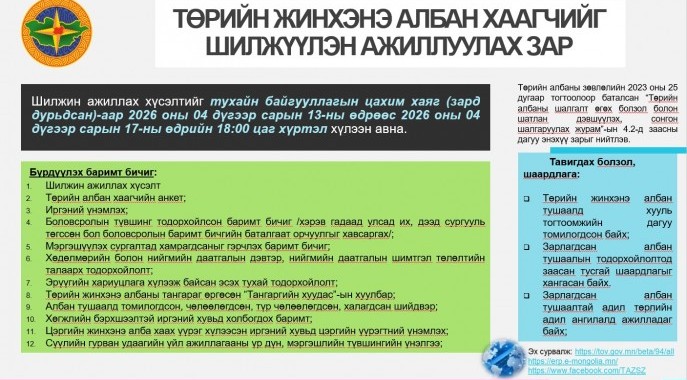 Цахим бүртгэлийн хугацаа: 2026.01.29-2026.02.11-ний өдрийн 17:00 цаг хүртэл Бүртгэлийн линк https://se.csc.gov.mn/search?sector_id=02001046 Шалгалт: 2026.02.26-аас хуваарийн дагуу зохион байгуулагдана....