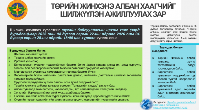 Төрийн албаны зөвлөлийн 2023 оны 25 дугаар тогтоолоор баталсан “Төрийн албаны шалгалт өгөх болзол болон шатлан дэвшүүлэх, сонгон шалгаруулах журам”-ын 4.2-д заасны дагуу энэхүү зарыг нийтлэв. ...