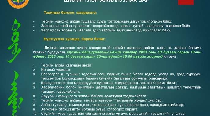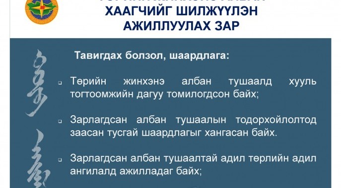 ТӨРИЙН ЖИНХЭНЭ АЛБАН ХААГЧИЙГ ШИЛЖҮҮЛЭН АЖИЛЛУУЛАХ ЗАР 2023.10.10