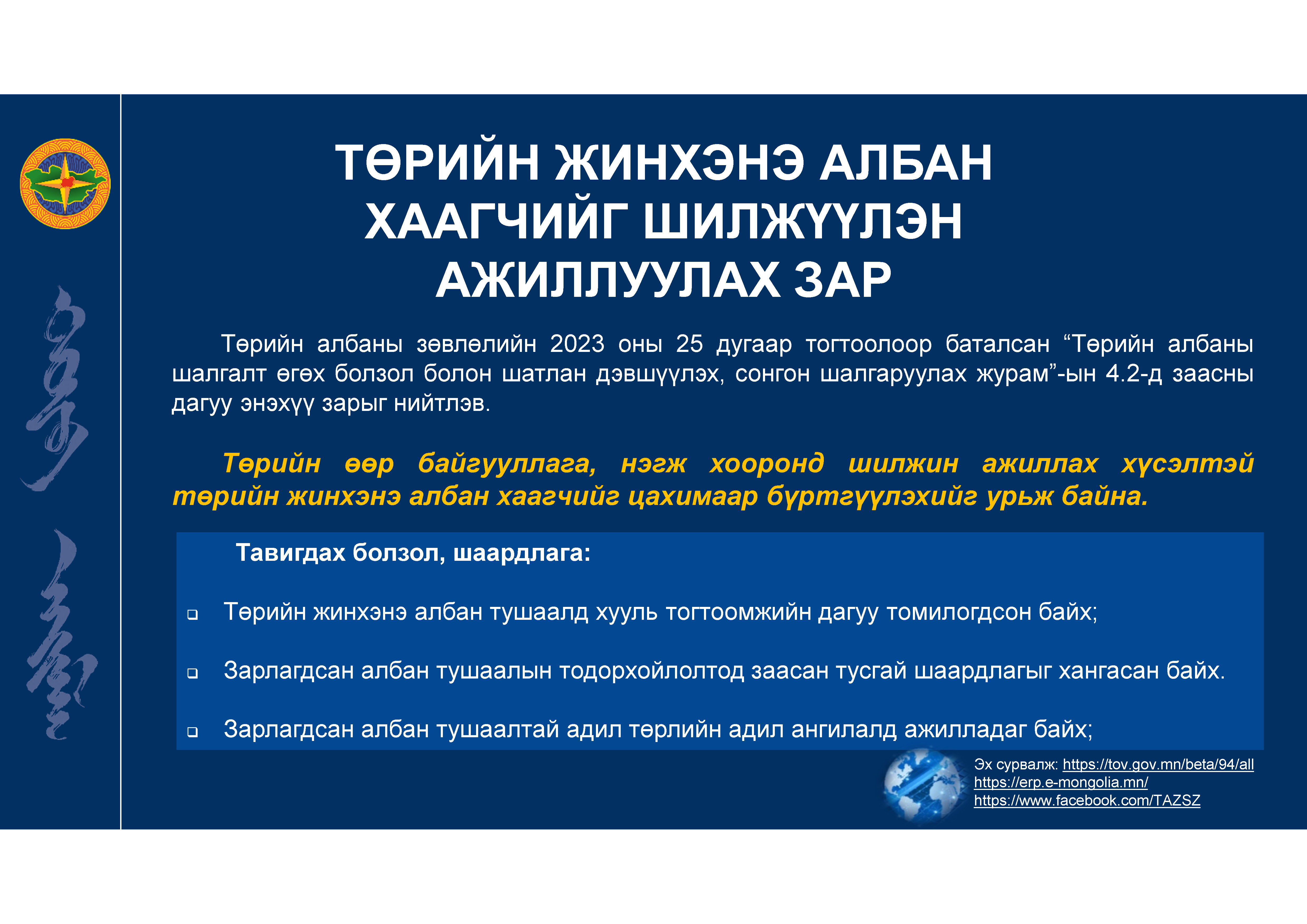 ТӨРИЙН ЖИНХЭНЭ АЛБАН ХААГЧИЙГ ШИЛЖҮҮЛЭН АЖИЛЛУУЛАХ ЗАР 2024.06 САР